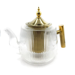 Стеклянный заварочный чайник — уютный и стильный аксессуар для вашей кухни, в котором так красиво заваривать различные сорта чая. Современный оригинальный дизайн посуды для чая делает ее универсальной — прозрачное рифленое стекло с металлической золотистой крышкой дополнят любую цветовую гамму вашей кухни или гостинной. Заварочный стеклянный чайник выполнен из термостойкого боросиликатного жаропрочного стекла, поэтому легко выдерживает высокую температуру. Удобная ручка заварника не нагревается, тем самым обеспечивает его комфортное использование. Внутри чайника предусмотрен отдельный отсек для заварки, которые надежно закреплен и не позволяет листьям чая попадать в колбу. Объем заварочного чайника с ситечком: 900 мл. Чайник для заварки совершенно не впитывает запахи и сохраняет неизменным вкус и аромат напитка. Поэтому смело заваривайте в нем ягодный чай, а затем травяной и фруктовый, или наоборот — вкусы не смешаются между собой. Инвентарь для кухни станет вашей главной изюминкой и обязательно вызовет восхищение у домашних или гостей.